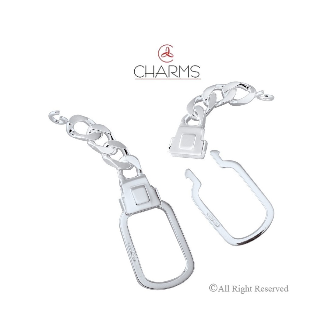 Portachiavi con attacco rettangolare, rifinito da tre grosse maglie e con un anello aperto finale dove aggiungere a piacere qualsiasi abbellimento personalizzato. In argento 925 senza Nichel e Cadmio.
