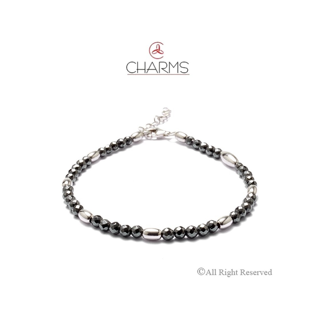 Bracciale Charms Uomo con ovaline in Argento 925 e palline di ematite sfacettata nera. La chiusura è con moschettone e allungo.
