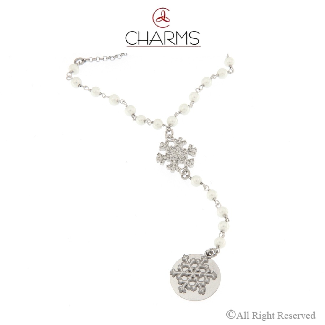Winter Bloom By CharmsCatenina finita rosario con perle e pendenti fiocco di neve con zirconi incassati, in argento 925 senza Nichel e Cadmio.