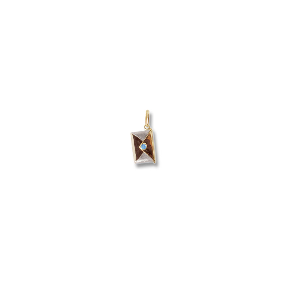 Splendido pendente o ciondolo Charms a forma di busta delle lettere in oro giallo e oro bianco 18K con pietra semipreziosa, unico nel suo genere realizzato con cura e competenza artigianale.