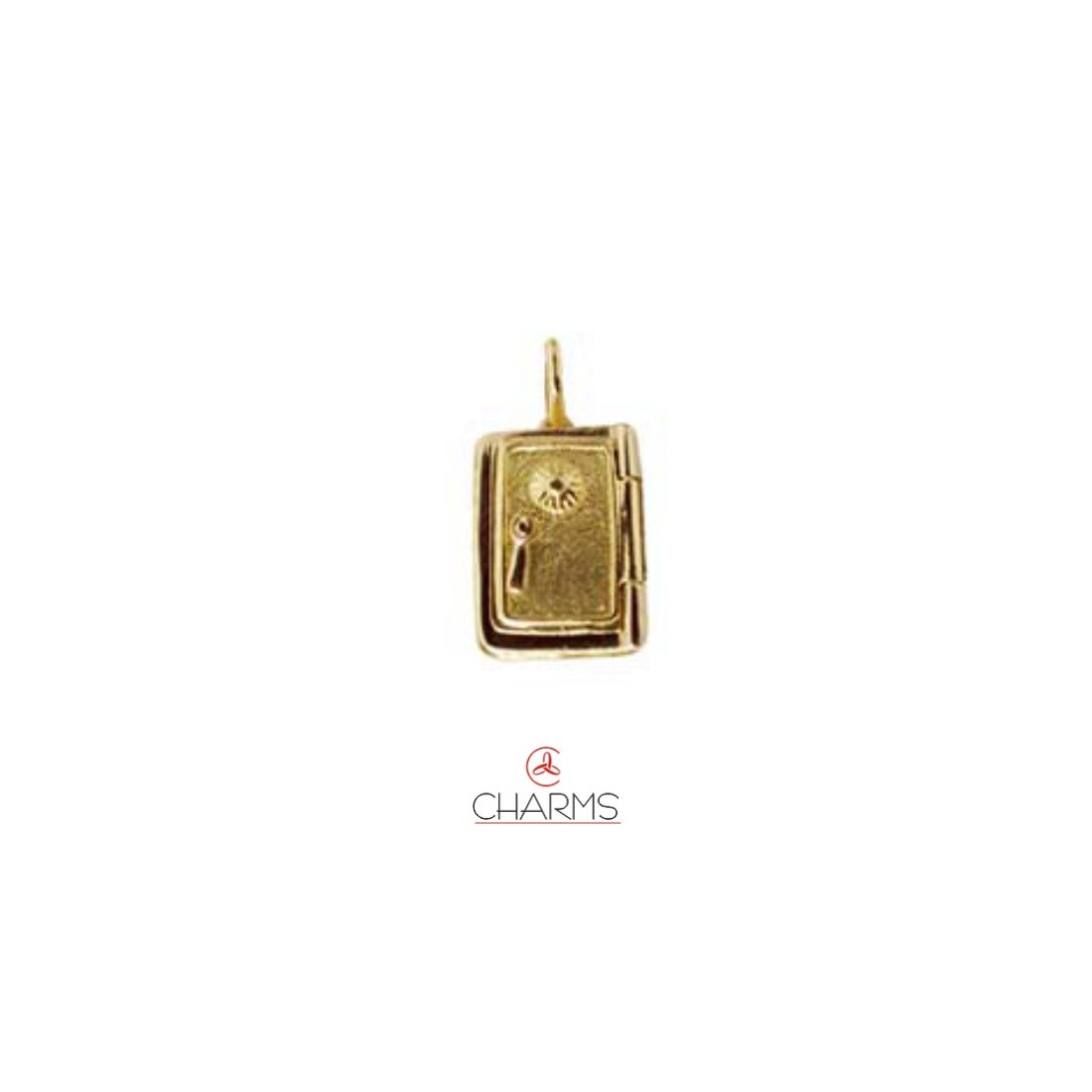 Splendido pendente Charms a forma di cassaforte che si apre e chiude con sacchetto per le monetine d' oro in oro giallo e oro bianco 18K , unico nel suo genere realizzato con cura e competenza artigianale.