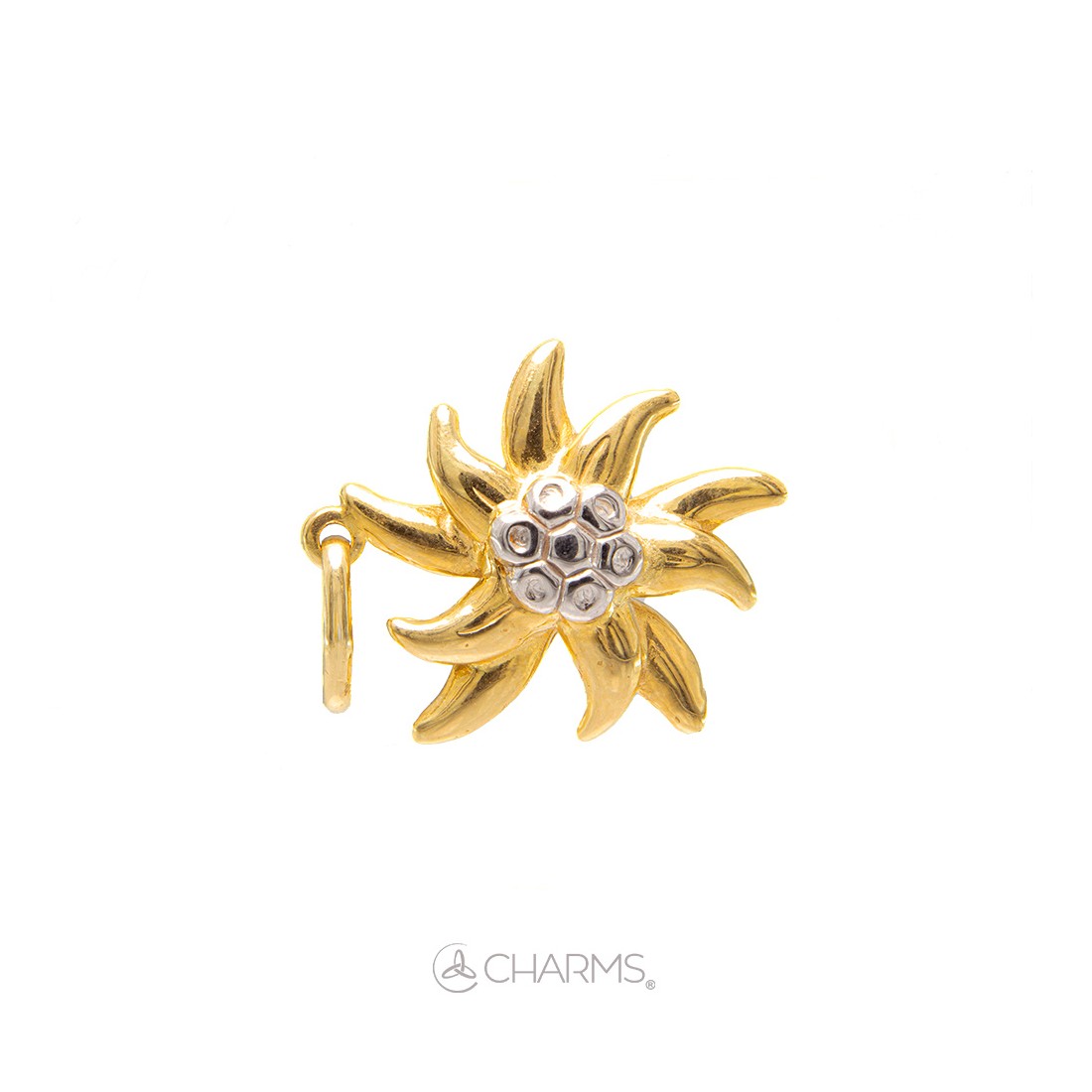Questo splendido charm o pendente o ciondolo CHARMS a forma di STELLA ALPINA è prodotto in oro giallo ed in oro bianco 18 carati, seguendo la tradizione e la competenza nella lavorazione dell'oro degli Artigiani Orafi.