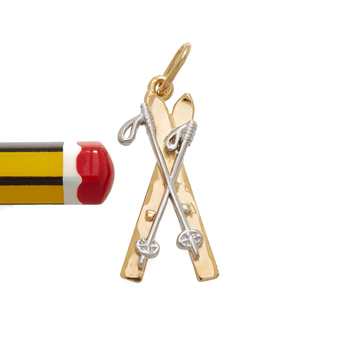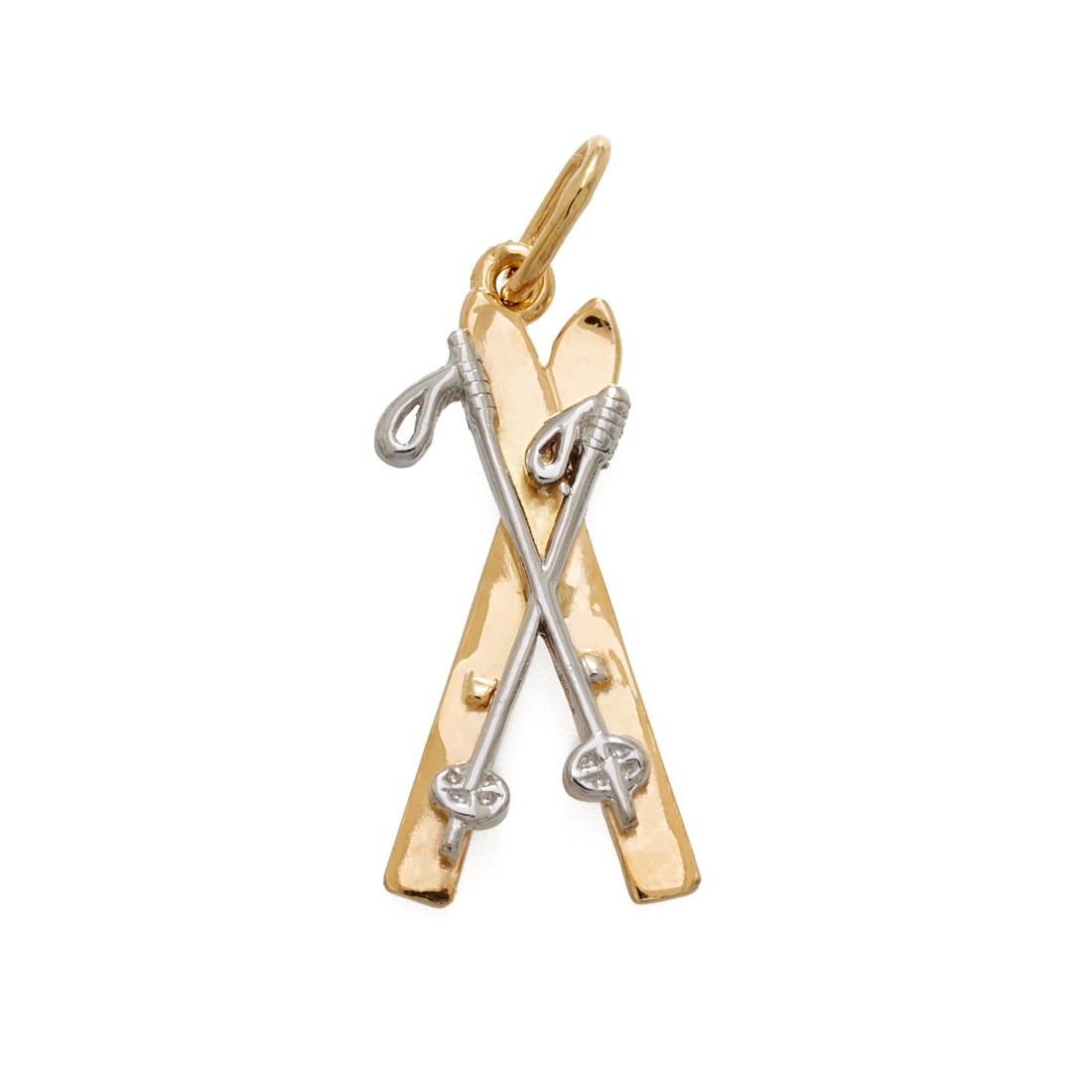 Splendido pendente Charms a forma di sci da discesa in oro giallo e oro bianco 18 Carati, unico nel suo genere realizzato con cura e competenza artigianale.